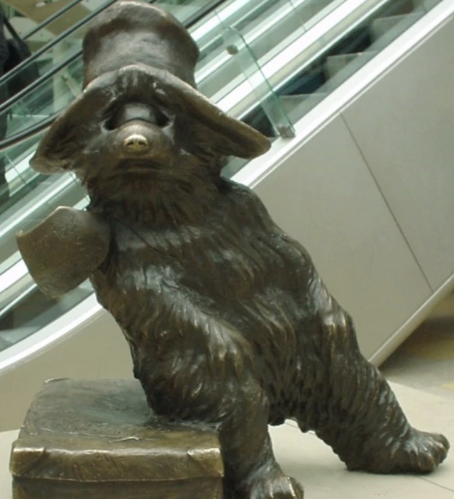 当时帕丁顿可怜兮兮地呆在帕丁顿火车站的失物招领处外,坐在一只被压扁的行李箱上,大衣上还挂着一个牌子:“请照顾这只熊,谢谢。”这是它的婶婶露西写的。因为不知道它的秘鲁名字,于是布朗夫妇便根据车站的名字,为它起名叫帕丁顿。