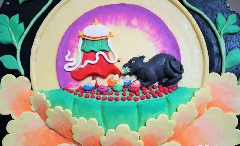 酥油花是以酥油为原料制作的以佛像、人物、花卉树木等为主要内容的艺术作品,是雕塑艺术的一种特殊形式。由寺院艺僧以酥油为原料精雕细捏而成,形象逼真、色彩丰富,具有很高的艺术水平和艺术魅力。