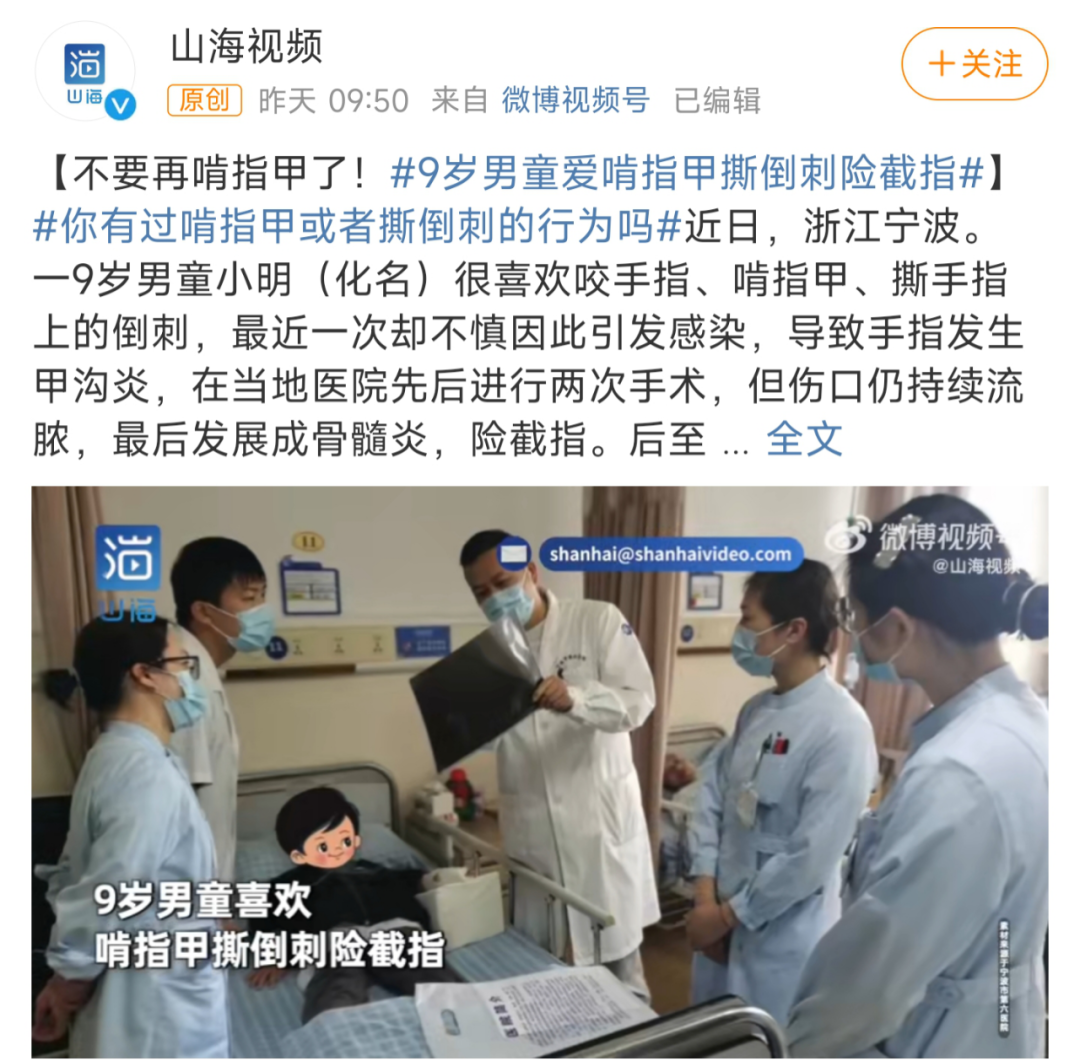 这个消息如同晴天霹雳,谁都没想到,只是啃指甲这么小的问题竟然会和“截指”挂钩,想到孩子才9岁,小明的父母陷入了痛苦、自责和绝望。