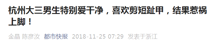 一位21岁男生经常贴着甲床把手指甲、脚趾甲剪得很短。因为这种错误的剪指(趾)甲习惯,得了慢性甲沟炎,趾甲上像长了一颗肉瘤。