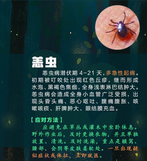 建议:①被叮咬后切勿生拉硬拽,蜱虫口器折断在皮肤中会增加感染风险;②野外游玩时要戴帽子,扎紧袖口和裤腿,回家后及时洗澡;③家中宠物做好定期驱虫。