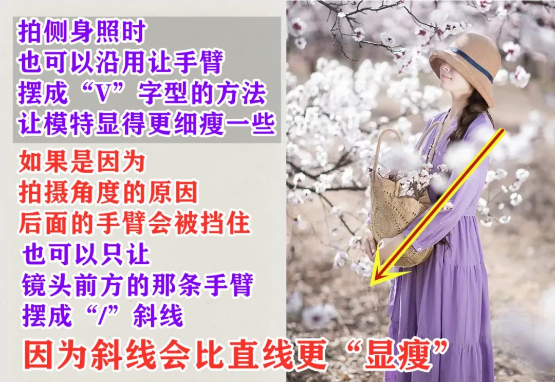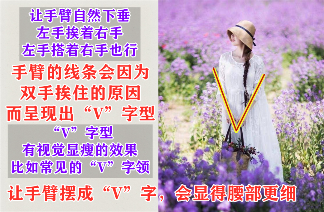 用“斜线”或者“V”字型的姿态,让视觉效果更“细瘦”一些。