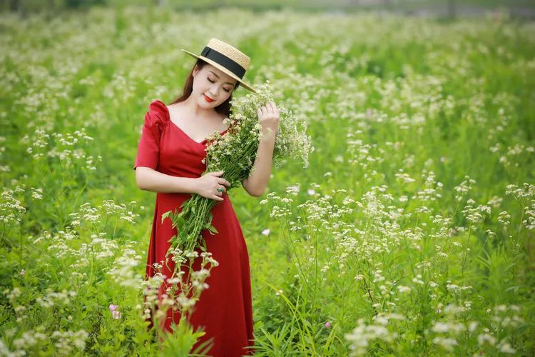 比如双手提着包包,花篮,拿着同一朵花什么的……
