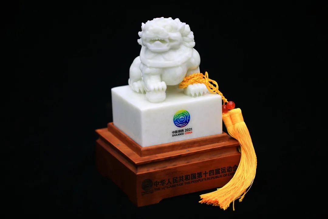 展品中还有一尊“宝玺”,就是全运会特许纪念宝玺。玉制宝玺是历代重大事件的收藏精品,2008年北京奥运会就推出奥运会宝玺,被广大收藏爱好者一扫而光。