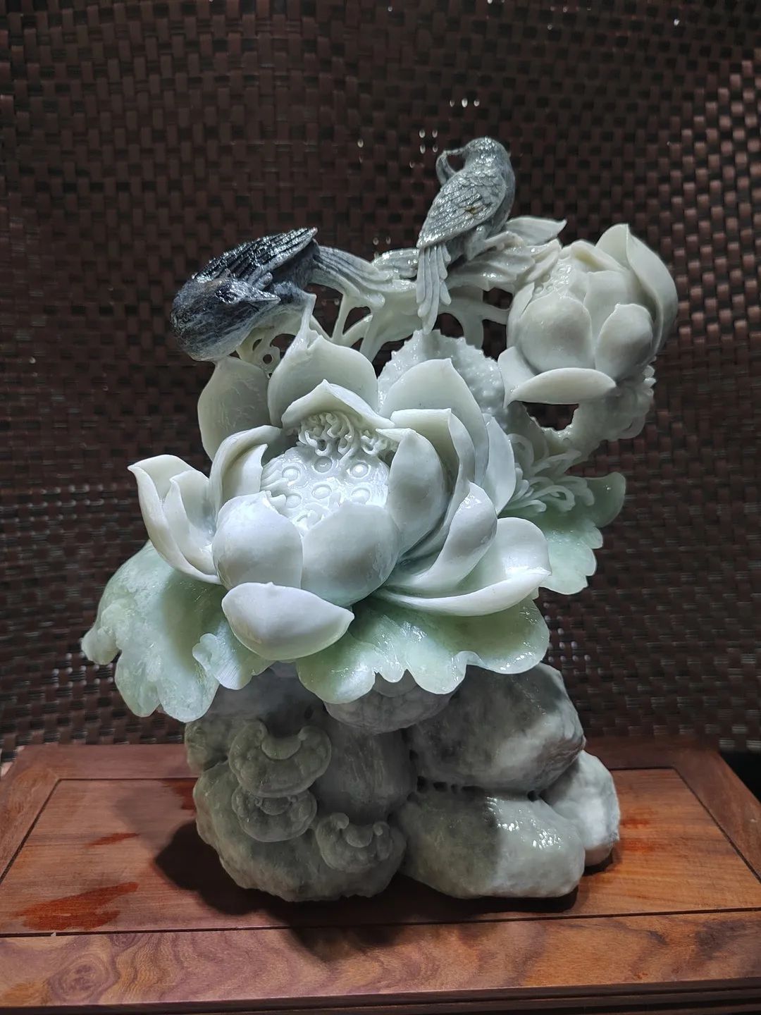 由于杂石部分和玉石部分有强烈的色彩对比,让代策有了俏色巧雕的方案。最终,他把上面的杂石设计成两只小鸟,下面的杂石设计成一块一块堆砌起来的石头,正好是个底座,中间的玉石部分设计成两朵盛开的荷花。