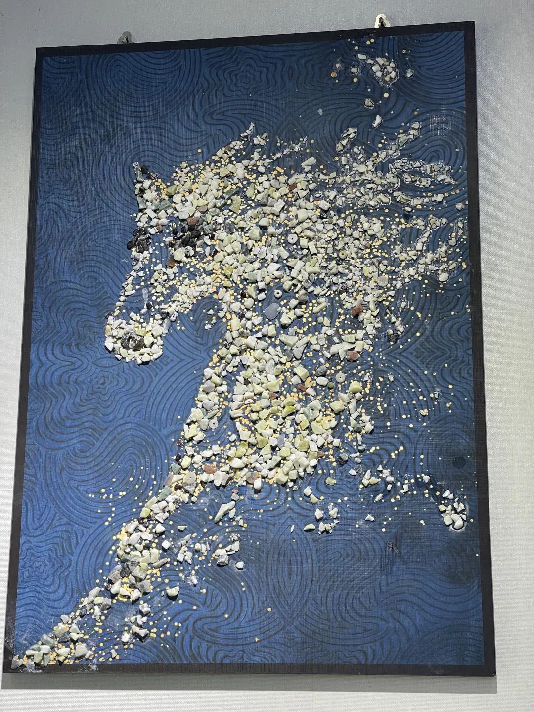 代策工作室挂了一幅飞马造型的作品,就是用各种碎玉做的。是那种让人看一眼,就有股冲动想买下的文创作品。