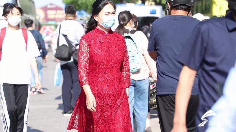 考生家长付女士说:“平时不怎么穿,今天心情特别激动。因为这三年孩子也挺辛苦的,孩子真的不容易。祝孩子能考上一个理想大学,旗开得胜。”