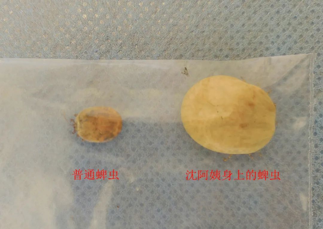 俞仲国医生说沈阿姨身上的这只蜱虫,外壳偏淡黄色,和人体皮肤颜色相近,不易被发现。他推断沈阿姨是上山挖笋时被咬的,十多天里蜱虫一直吸血变大,长成了近2cm的巨型蜱虫。