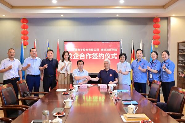 2022年6月7日下午,宿迁技师学院与苏州固锝电子有限公司隆重举行“固锝电子产业学院”签约仪式。苏州固锝电子有限公司实际控股人、终身名誉董事长吴念博,总经理滕有西,副总经理陈瑞珠、家文化研究顾问章坚,宿迁技师学院党委书记、院长张兵营,曹集乡党委书记周玲玲,学院招生就业处负责人李成建,机电工程系负责人杨仓军等出席此次签约仪式。
