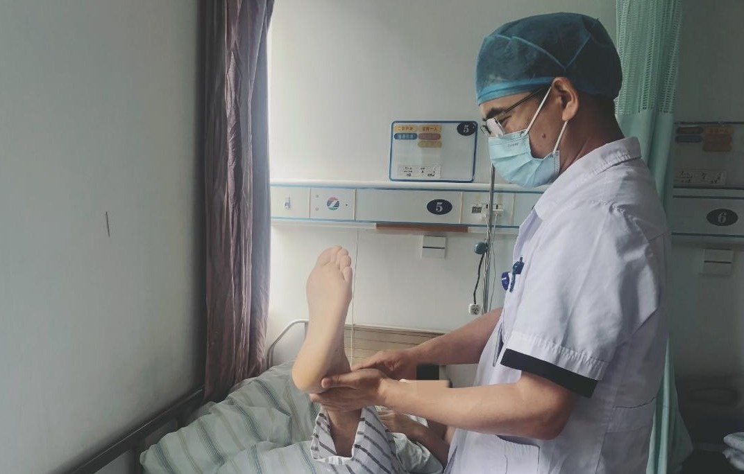 疼痛科医师正在为患者进行直腿抬高试验,患者已恢复正常。