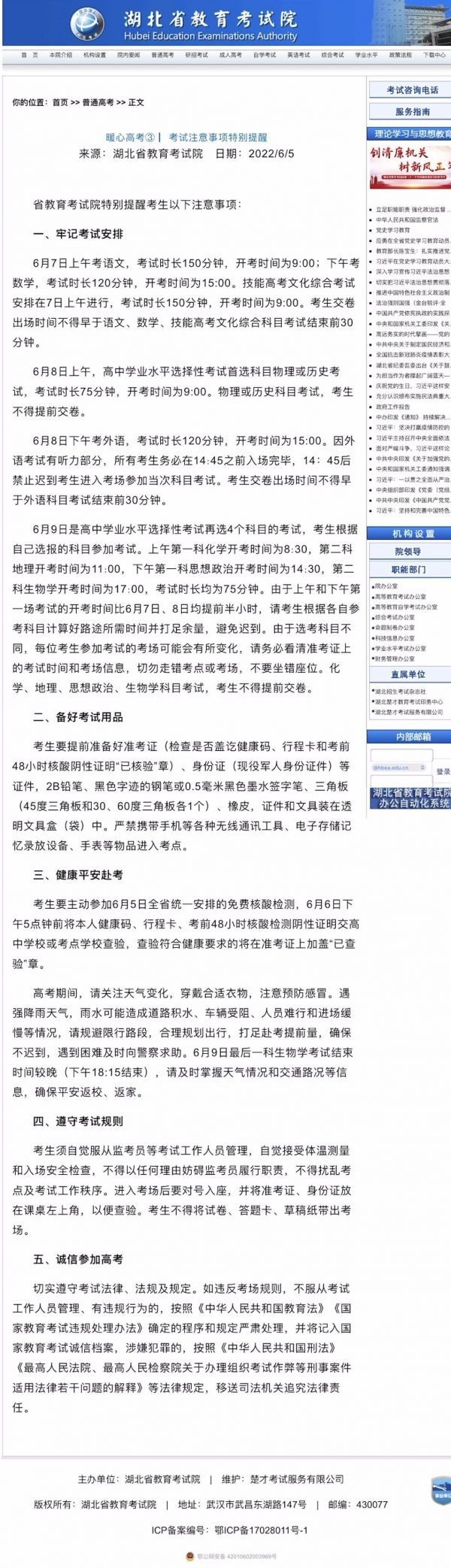 湖北省教育考试院提醒,6月9日是高中学业水平选择性考试再选4个科目的考试,考生根据自己选报的科目参加考试。上午第一科化学开考时间为8∶30,第二科地理开考时间为11∶00,下午第一科思想政治开考时间为14∶30,第二科生物学开考时间为17∶00,考试时长均为75分钟。