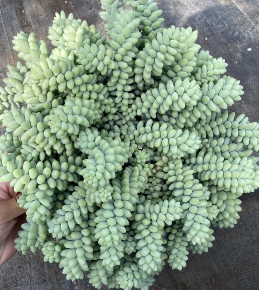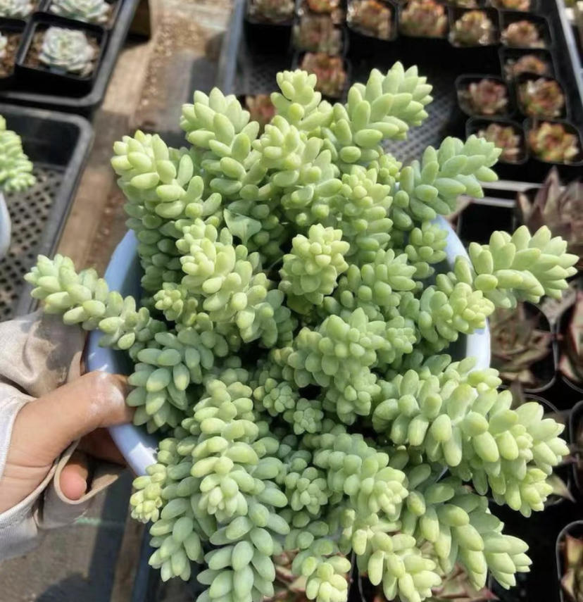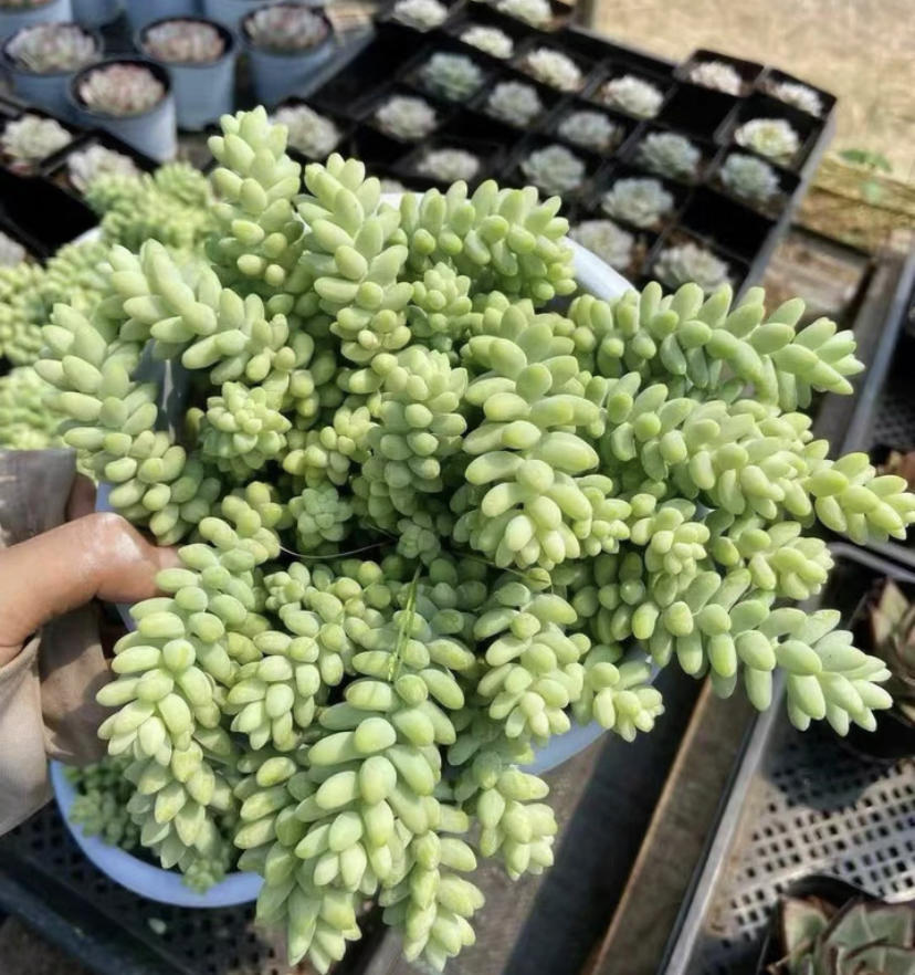 “玉缀”,这个品种在多肉植物中可以说是经久不衰,买的人不是很多,但是每年都会有人去买它,价格便宜,好养护,基本上露天养护的情况下,不需要任何的人工管理,也不用浇水,靠天吃饭就能迅速生长。