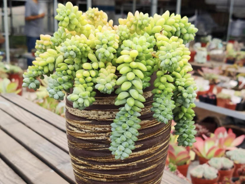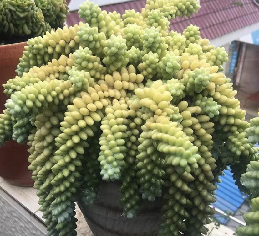 玉缀是一种非常适合放置在露天养护的多肉,尤其是家有露台或者是有平台的情况,直接将玉缀悬挂在空中,让它的叶子自然垂吊生长,不到一年的时间里,就能完成爆盆,生长速度巨快,再加上室外养护的玉缀有着充足的日照,和十度的雨水,不需要施肥,生长速度至少能增加三倍。