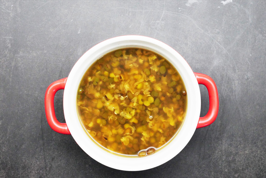 具体做法:绿豆经过筛选以后,把它进行浸泡,大概泡2个小时左右,然后再拿高压锅来压,压的时候可以来点糯米,还有花生,来增加它的风味层次感,最后来点冰糖,就可以了。