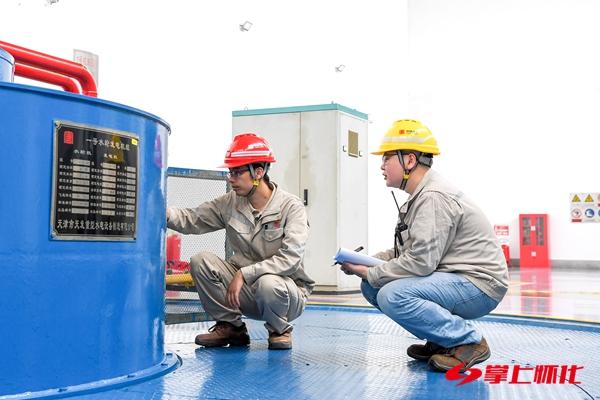 (粟保军(左)和同事对电机进行巡检。)