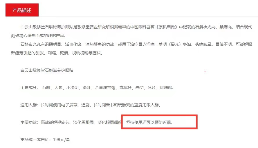未来网北京6月8日电(记者 黄佳)近日,百年医药老字号敬修堂为了宣传旗下产品石斛滋养护眼贴,在其官方网站上声称坚持使用该产品,可以预防近视。