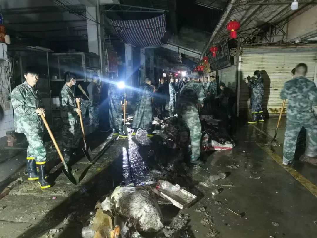 民族市场地处融水苗族自治县城区低洼地,历年来清淤任务最重,对群众生活影响最大。由于市场棚建多、间距小,大型机械难展开,大家不畏艰难、锹挖手抬,不怕疲劳、连续作战,持续清理5小时,圆满完成清淤任务,为恢复市场灾后秩序奠定坚实基础。