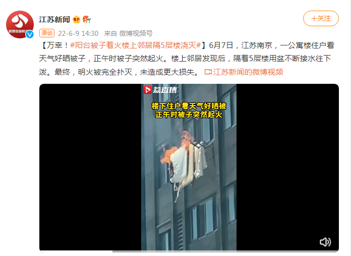 6月7日,江苏南京,一公寓楼住户看天气好晒被子,正午时被子突然起火。楼上邻居发现后,隔着5层楼用盆不断接水往下泼。最终,明火被完全扑灭,未造成更大损失。