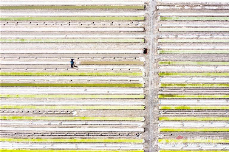 高空俯瞰,一条条笔直的水道与洁白的盐形成了一道独特的风景。巴图 摄
