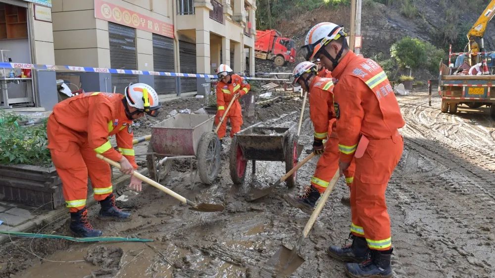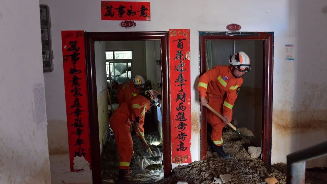 经过一天的持续奋战,共清扫淤泥埋压房屋8幢,清理坍塌路段7处,恢复交通,配送应急物资满足三日用量。