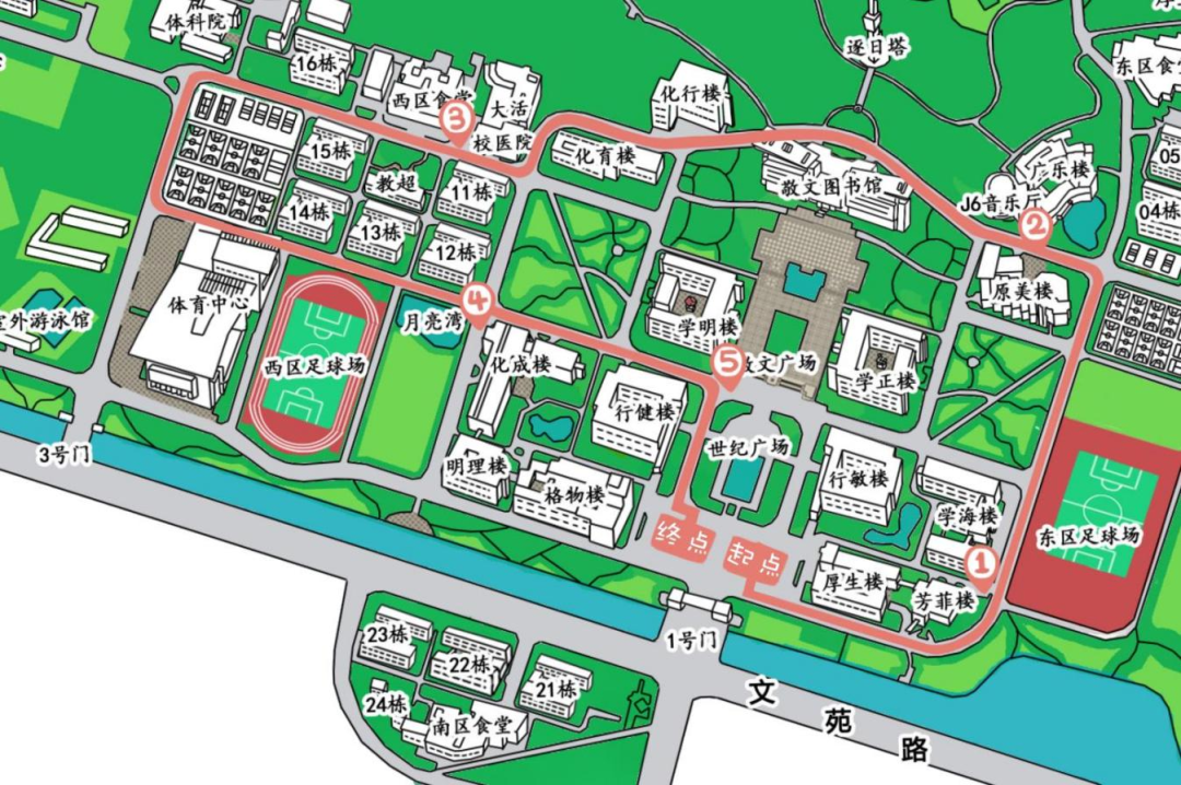 世纪广场东侧草坪(起点)→芳菲楼→音乐厅→大学生活动中心→月亮湾→敬文图书馆广场→世纪广场西侧草坪(终点)