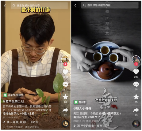 东阳市非遗木梳制作技艺代表性传承人陈浩归是一名“95后”,他设计的木梳在保留传统手艺的基础上,还通过创新的设计、新颖的造型而受到更多年轻人的喜欢,将老木梳玩出了新花样;四川省工艺美术大师廖奥和紫砂壶结缘已有二十余年,其制作的新一代潮州壶获奖无数,如今从幕后走到台前的他在抖音分享每一把壶的制作工艺,让潮州壶的艺术性和社会影响力都得到了提高。