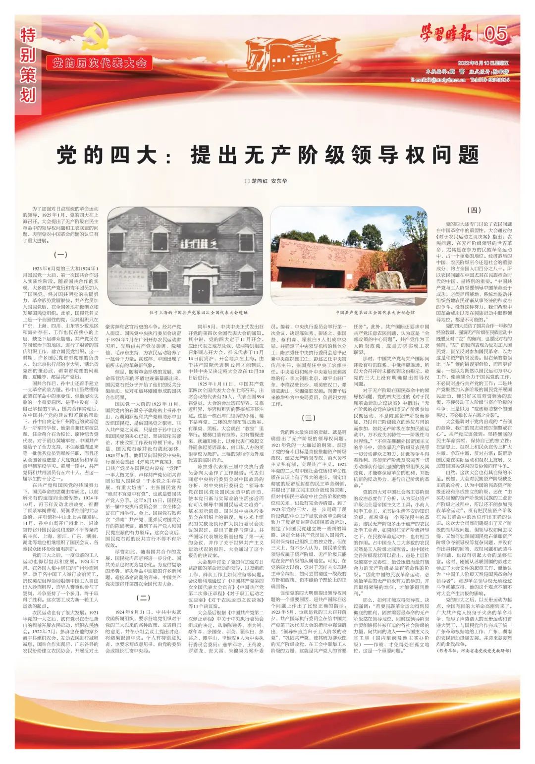 党的四大最突出的贡献,就是明确提出了无产阶级的领导权问题。1921年党的一大通过的纲领,规定了党的奋斗目标是直接推翻资产阶级政权,建立无产阶级专政,消灭资本主义私有制,实现共产主义。1922年党的二大对中国社会性质和革命性质在认识上有了很大的进步,制定出彻底的反帝反封建的民主革命纲领,并提出了建立民主联合战线的原则,但对中国民主革命中社会各阶级的地位和关系,仍没有完全弄清楚。到了1923年党的三大,进一步明确了现阶段党的中心工作是联合各革命阶级致力于反帝反封建的国民革命运动,制定了同国民党建立统一战线的策略,决定全体共产党员加入国民党,同时保持自己组织上的独立性。但在三大上,有不少人认为,国民革命的领导权属于资产阶级,无产阶级只能站在资产阶级的从属地位。可见,在党的四大以前,党对于怎样去实现民主革命纲领,如何去贯彻这一战线的方针和政策,仍不能给予理论上的正确回答。