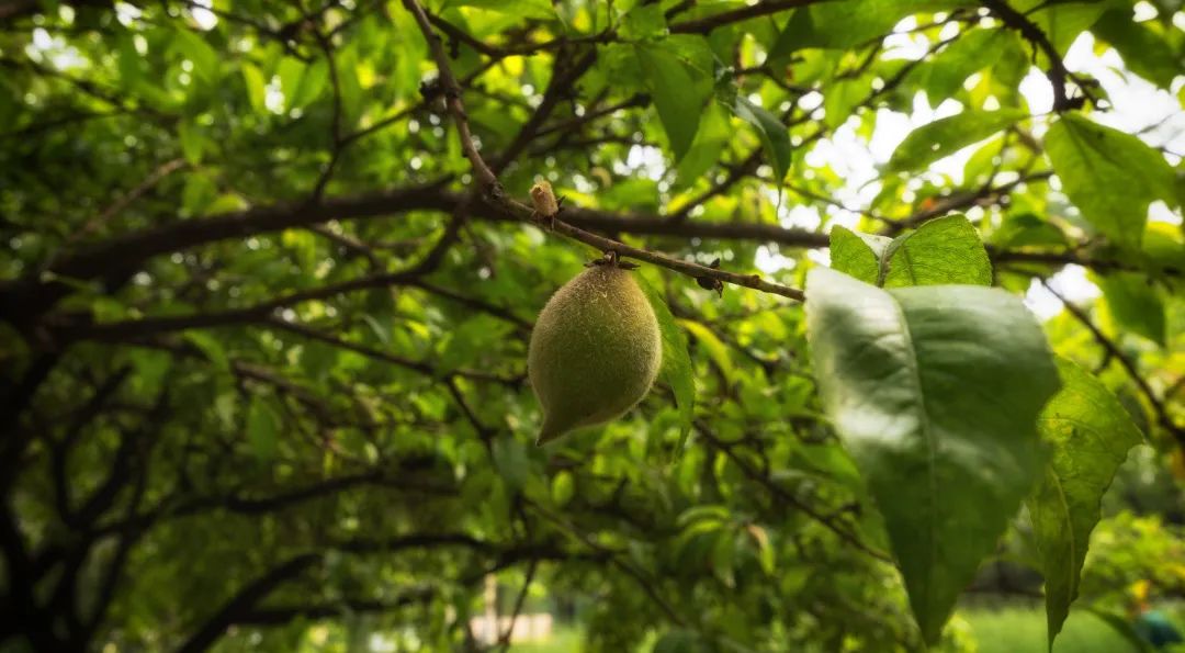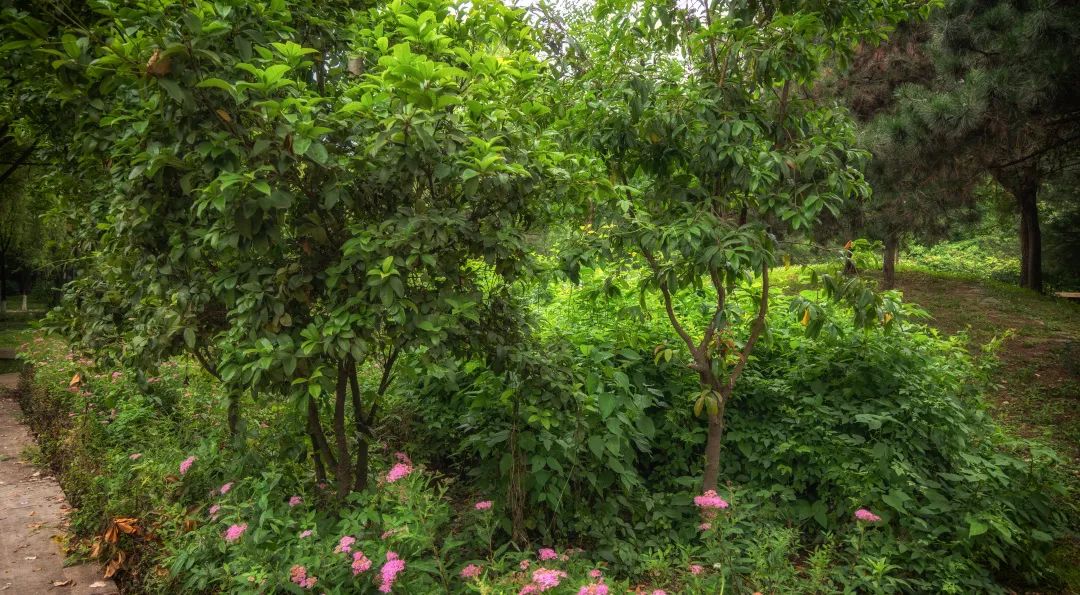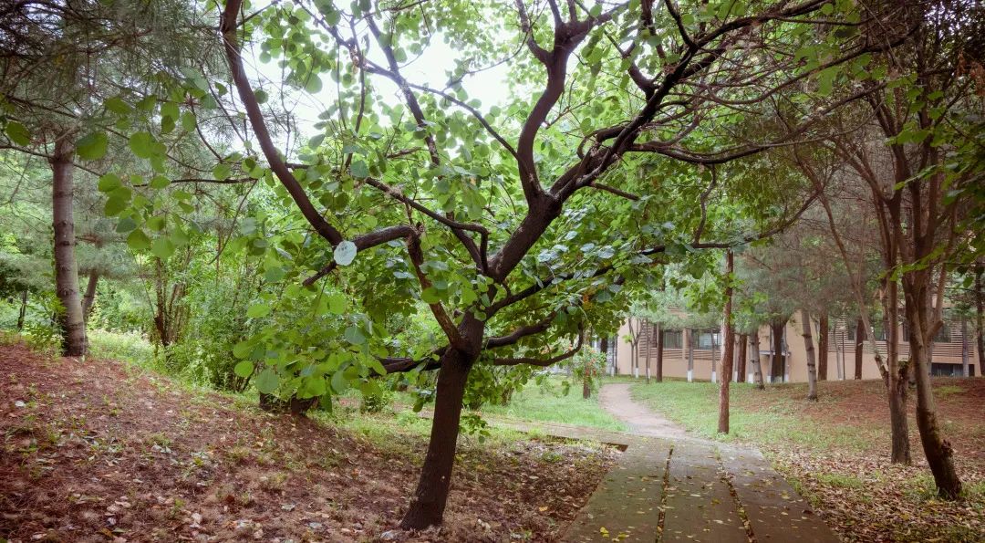 山桃种植在丁香和体育馆之间,是校园里一抹别样的色彩。