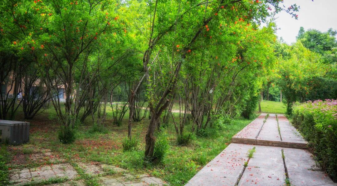 石榴花种植于图书馆与A楼附近,盛开的石榴花,也能为日常的学习生活增添一抹颜色。