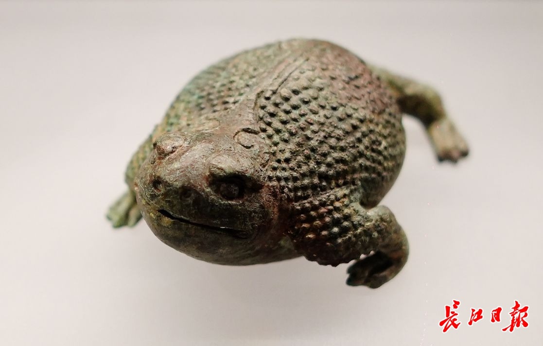 该展览分为“大江之中”“巴楚之地”“千年走廊”三个部分。在“千年走廊”部分,记者看到一只出土于宜昌秭归窑湾遗址的三足铜蟾蜍,周身布满青铜绿锈,前半身有两只脚,后半身一只脚,长在尾部。文物说明提示它俗称金蟾蜍,道教文化有“刘海戏金蟾”之说。金蟾蜍寓意财源兴旺,幸福美满。