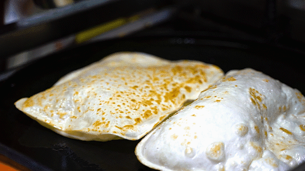 初始加工完毕,大叔在旁麻利接过,将饼皮摊在铁板上,看它慢慢鼓胀成一个方口袋。