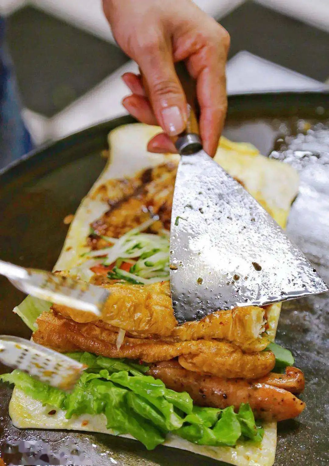 狠狠咬上一大口,葱花与鸡蛋在唇齿间交织出美妙的乐章,酱汁咸香四溢,烤肠在咀嚼中带来极大的满足感,夹在其中的生菜,又提供了水灵灵的清爽。