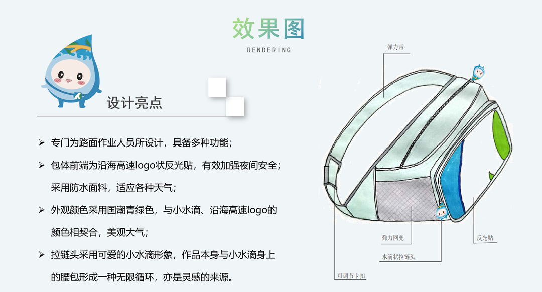 “小水滴”张开的双手呈现出拥抱的姿态,象征着沿海高速是一条温暖的大路,作为台州会客厅,正张开双臂笑迎八方来客。蓝色的小脚象征沿海高速正以稳健有力的步伐,在追求更高水平、更高品质的窗口服务征途中永不停歇。