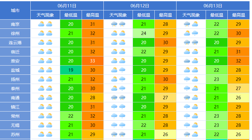 宿迁 | 今天傍晚到上半夜南部地区有阵雨或雷雨,夜里阴到多云,明天多云到晴 | 21℃ ~ 32℃ |