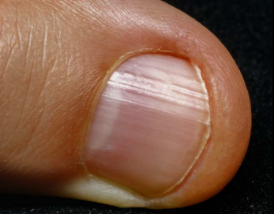其中,月牙在大拇指最明显,其他手指和脚趾可能不明显或者比较小,这是因为上方的皮肤遮挡住了(有时候是因指甲盖增厚而遮挡),没有暴露出来而已(如下图)。