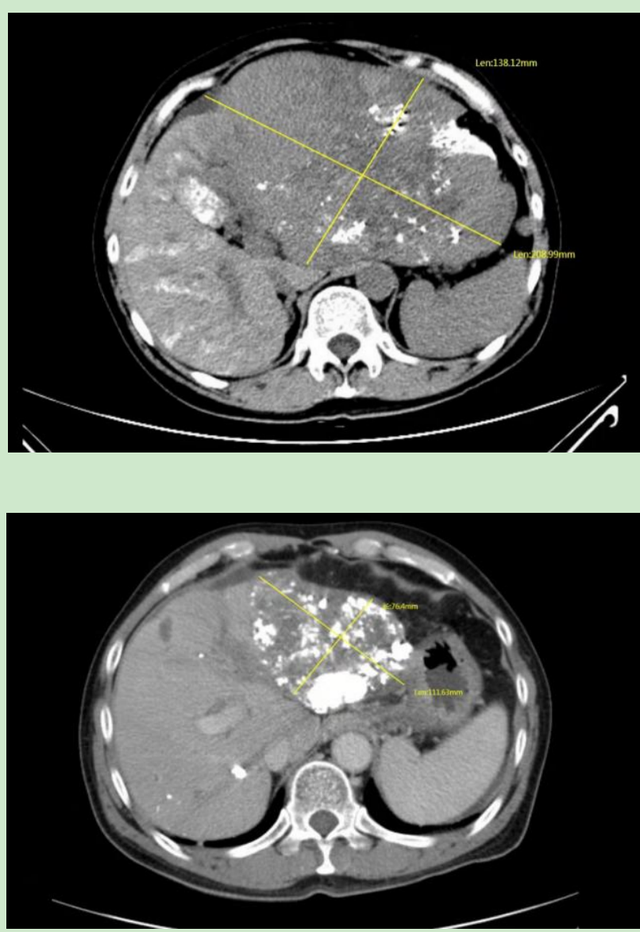 肿瘤相关指标的不断好转,让老吴越来越有信心。经过1年治疗,2021年4月复查结果显示,老吴甲胎蛋白从最高16950μg/L降至8.1μg/L,肝左叶肿物明显缩小,双肺多发小结节以及上纵膈、腔静脉后增大的淋巴结也都明显缩小,这意味着老吴的手术机会来了。