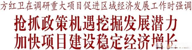 6月10日上午,省委常委、市委书记方红卫在新城区调研重大项目促进区域经济发展工作时强调,要抢抓政策机遇、挖掘发展潜力,加快策划落地建设一批具有引领性、带动性、示范性的大项目好项目,推动区域经济发展,全力以赴稳定经济增长。