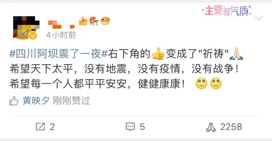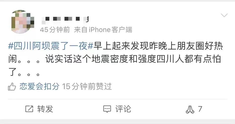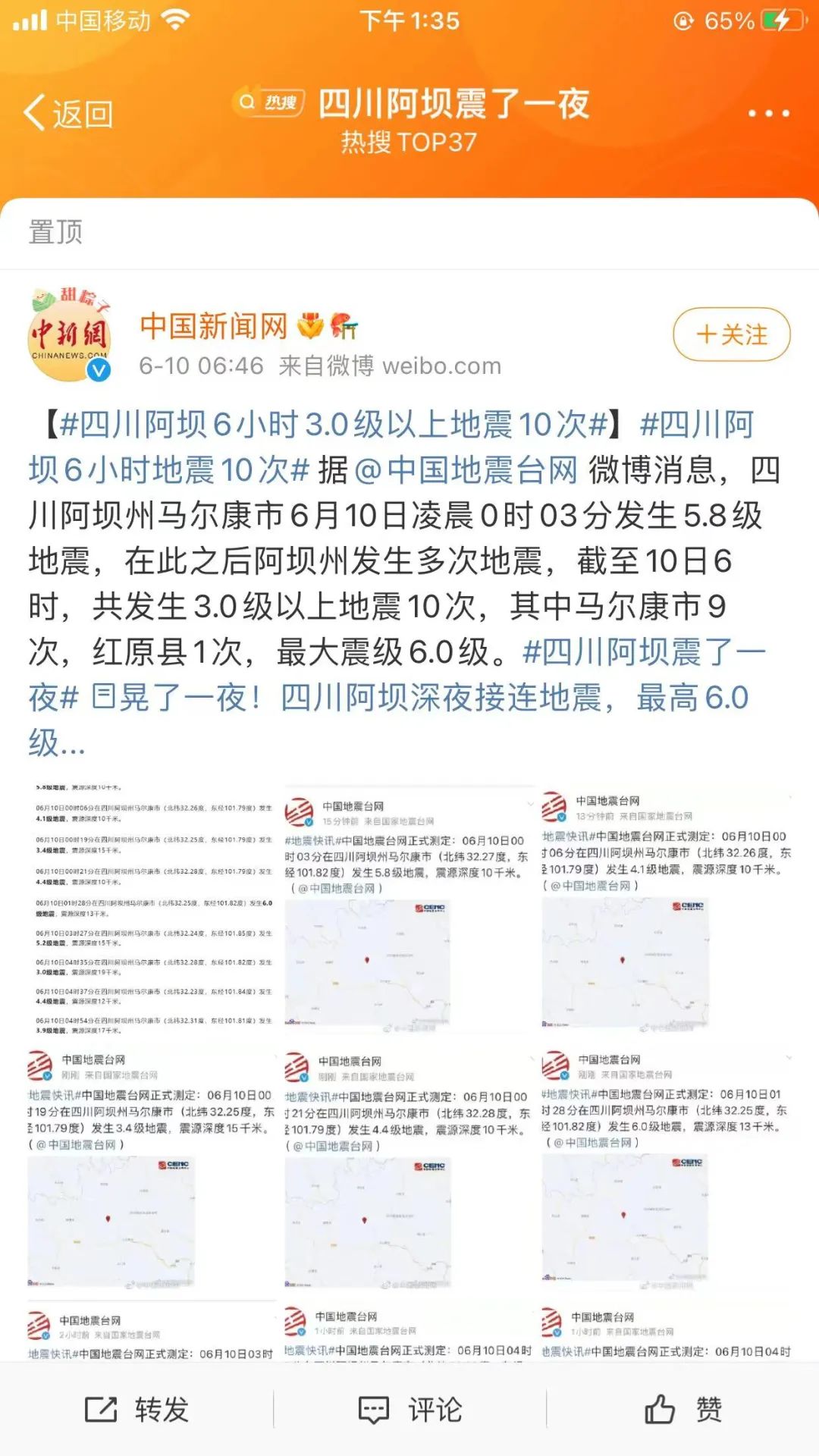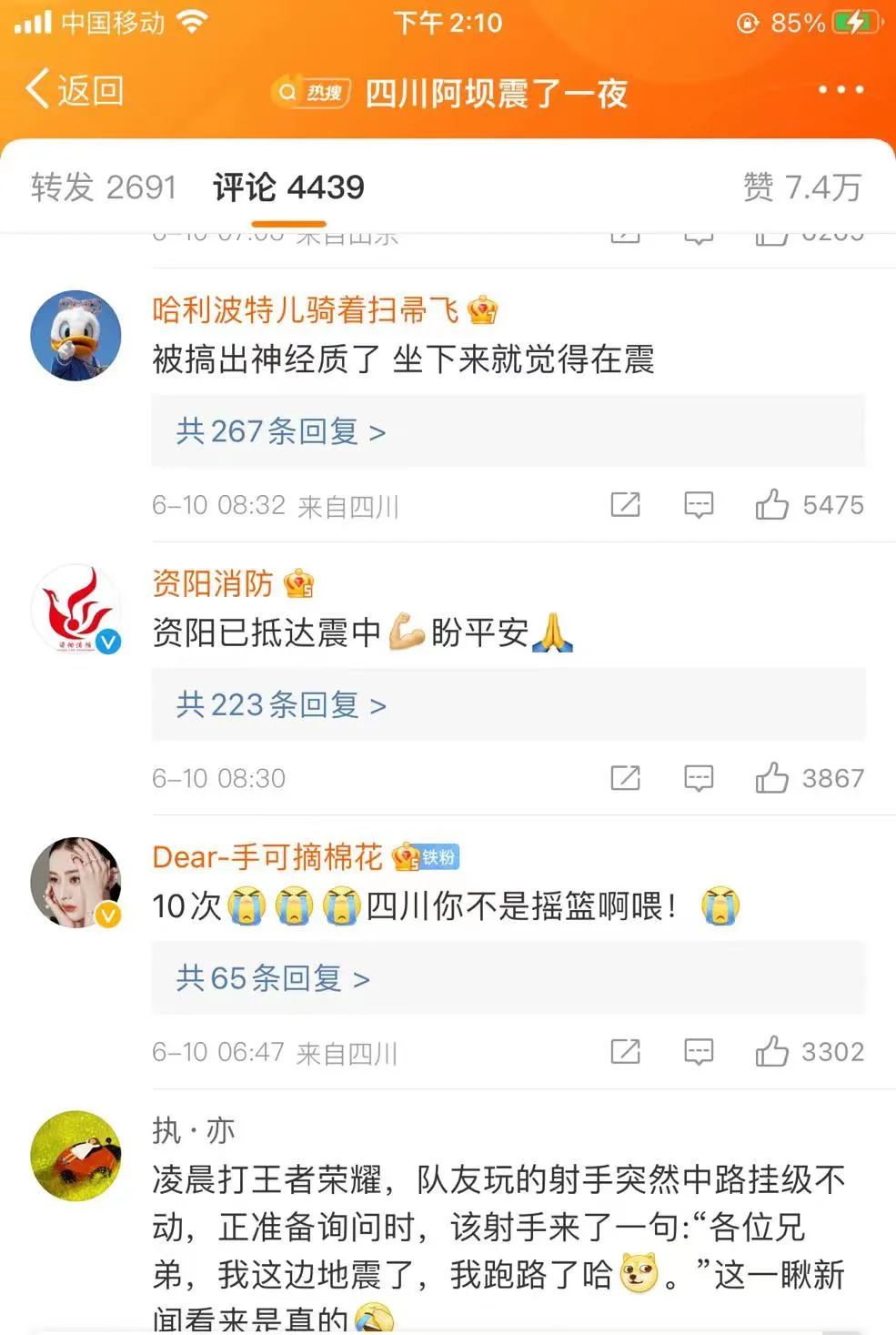 天亮后,“四川阿坝震了一夜”的话题冲上热搜。面对如此密集的强震,大家在话题下表达着自己当时的惊慌和担忧,祈祷平安。