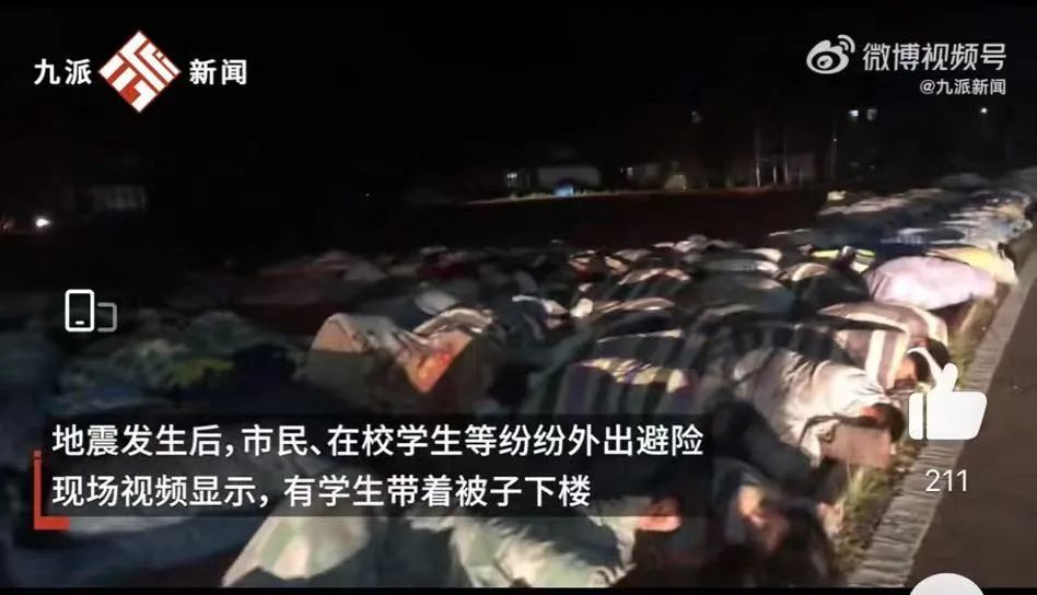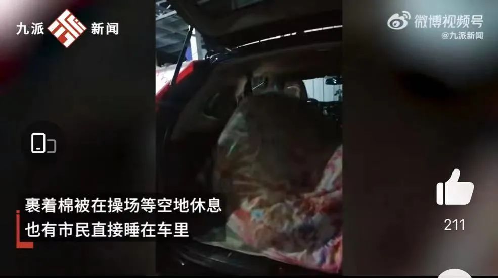 地震发生后,市民、大学生纷纷外出避险,有学生裹着棉被躺在操场休息,也有市民直接睡在了车里。