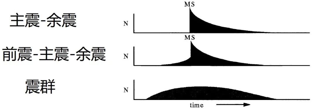 三种地震序列的地震数量与时间的关系示意图。MS代表主震