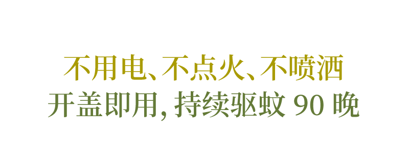 它使用极其方便:不用插电、不用点火、不用喷洒,开盖即用,一瓶可以覆盖15平米,持续有效90个夜晚。
