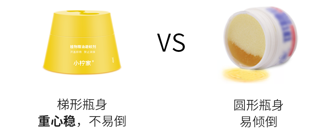 另外,小柠家驱蚊剂在产品的外形上也做了很多的贴心专利设计,比如瓶子做成了重心更稳的梯形,防止使用的时候倾倒。