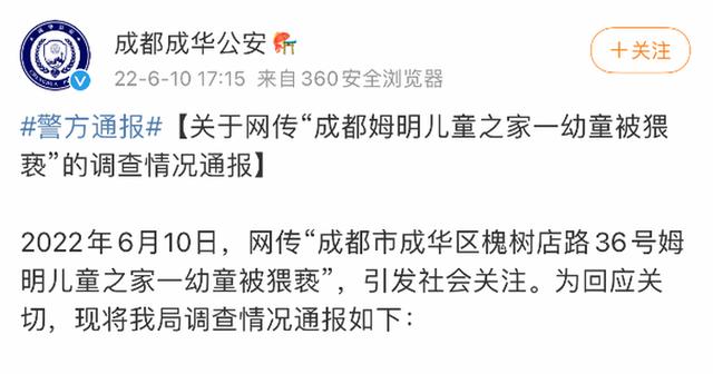 6月10日,网传“成都市成华区槐树店路36号姆明儿童之家一幼童被猥亵”,引发社会关注。为回应关切,成都成华公安对调查情况进行了通报。