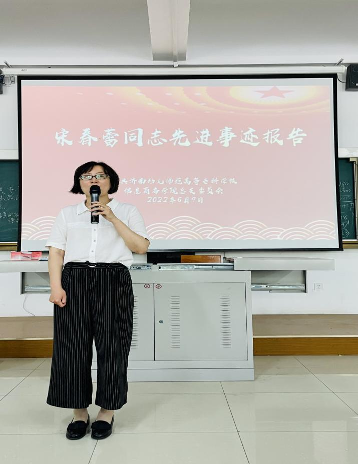 接着由信息商务学院宋春蕾老师做见义勇为的专题报告,宋老师将她勇救落水的整个过程向大家描述,面对紧急情况,来不及思考,她奋不顾身连鞋子都没来得及脱掉,毅然决然的跳下水救落水群众。宋老师表示,作为一名党员,就要第一时间展现出强烈的社会责任感,积极参与救灾救难。保持自己初心与爱心,用自己的行动践行了党员全心全意为人民服务的宗旨。