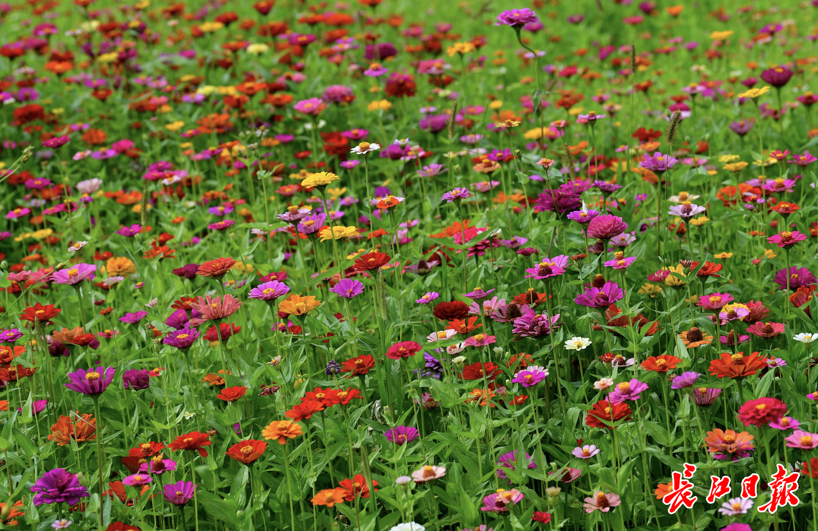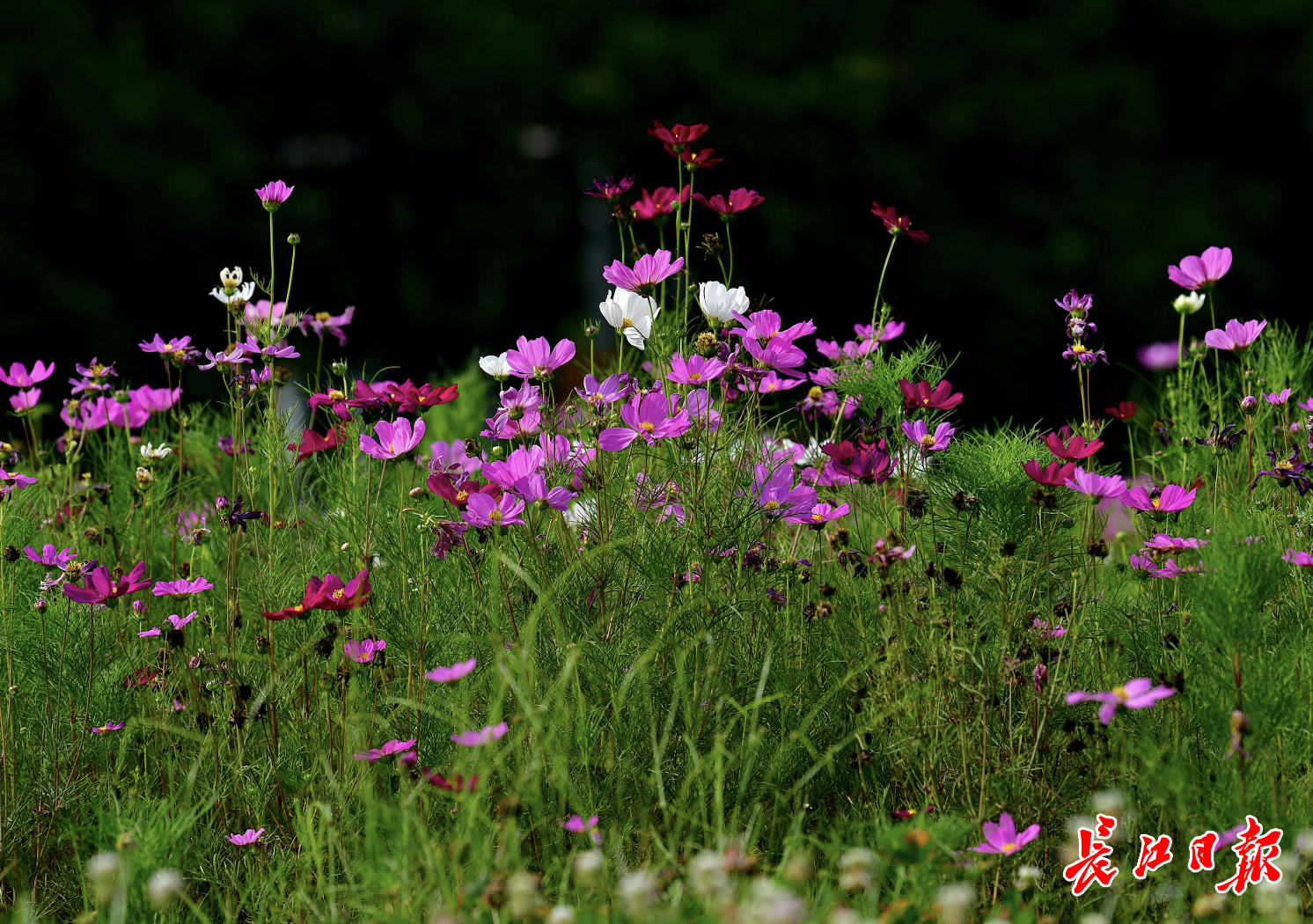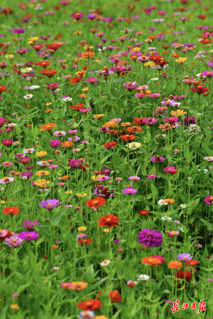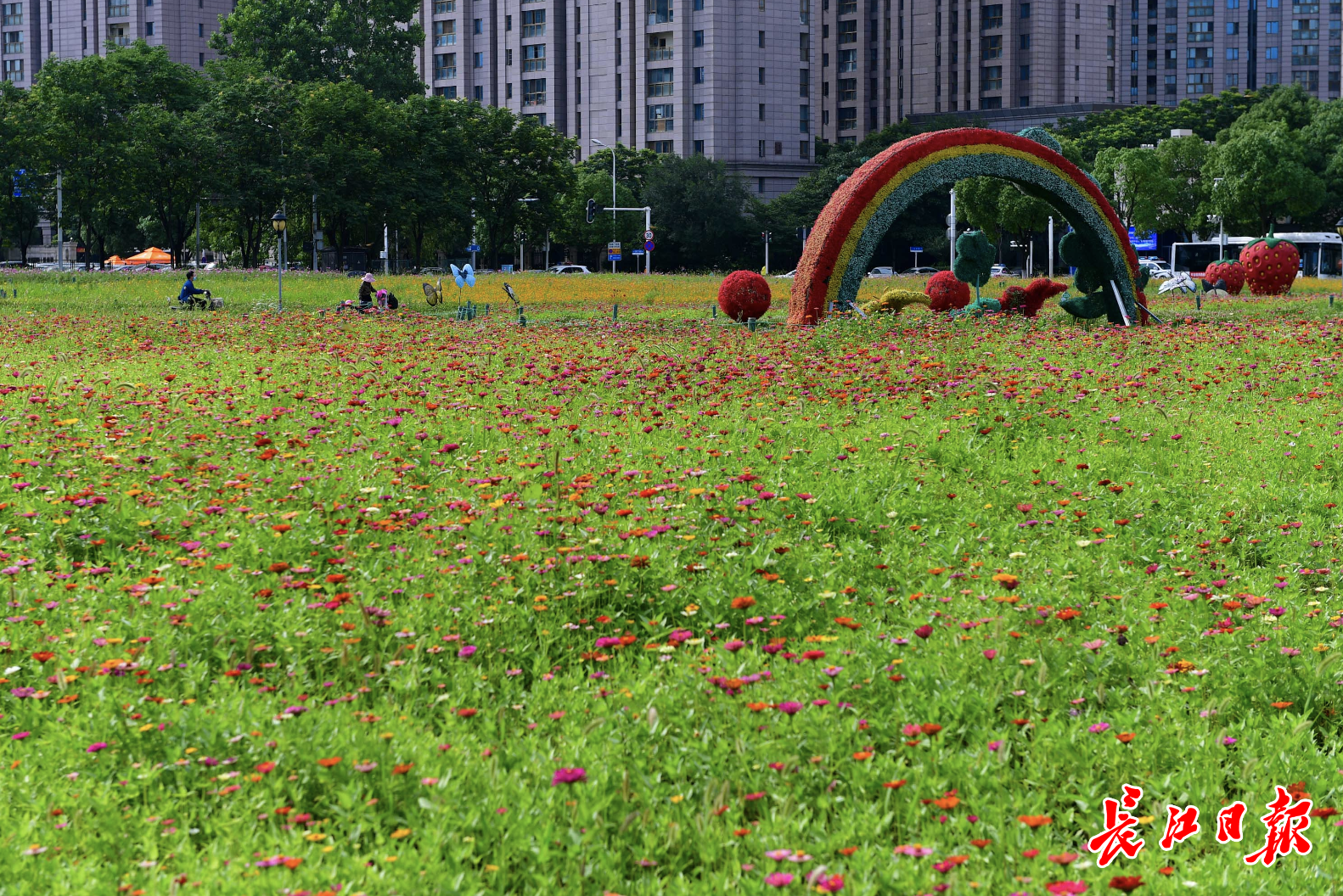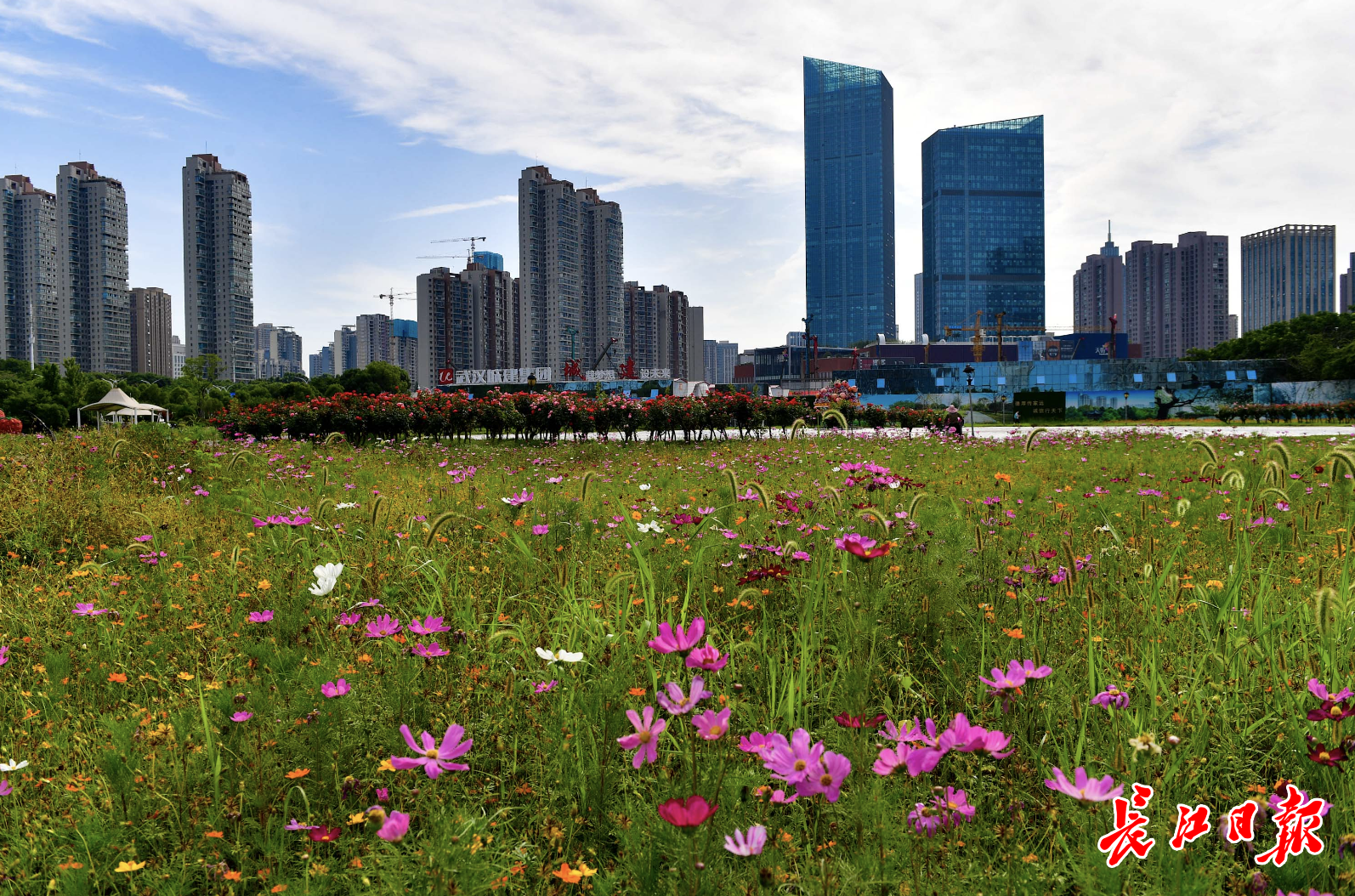 长江日报大武汉客户端6月11日讯 6月11日,武汉市江汉区泛海广场前,正值盛花期的硫华菊、波斯菊、百日菊开出了大片的夏季花海。金黄色的硫华菊、粉白色的波斯菊、五彩斑斓的百日菊与白车轴草、狗尾草等交织在一起,形成“草原花海”既视感。穿行其间,歌曲《火红的萨日朗》不自觉的在耳畔萦绕。点缀在花海中的“南瓜”、“草莓”、风车、木屋,以及环绕四周的摩天大楼,更让这片“草原花海”如一处闹市中的“世外桃源”。