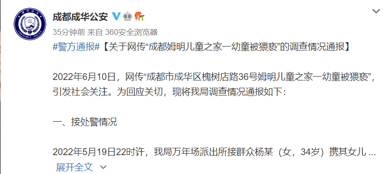 2022年6月10日,网传“成都市成华区槐树店路36号姆明儿童之家一幼童被猥亵”,引发社会关注。