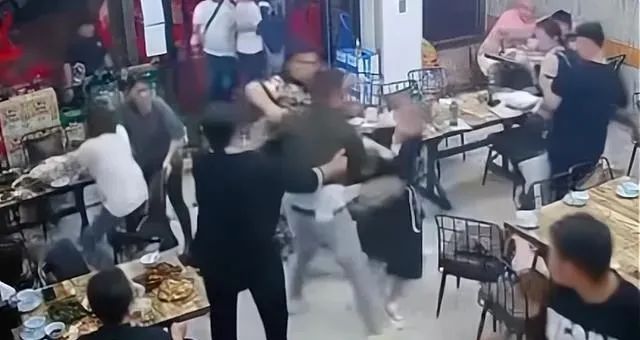 紧接着他就和女孩扭打在一起,这个时候从外面冲过来一个穿黑金色短袖的男人,冲到她们那桌一个穿黑外套的女孩身边,对她拳打脚踢;一个穿白色短袖的男人把一张铁凳子朝她们砸过去。