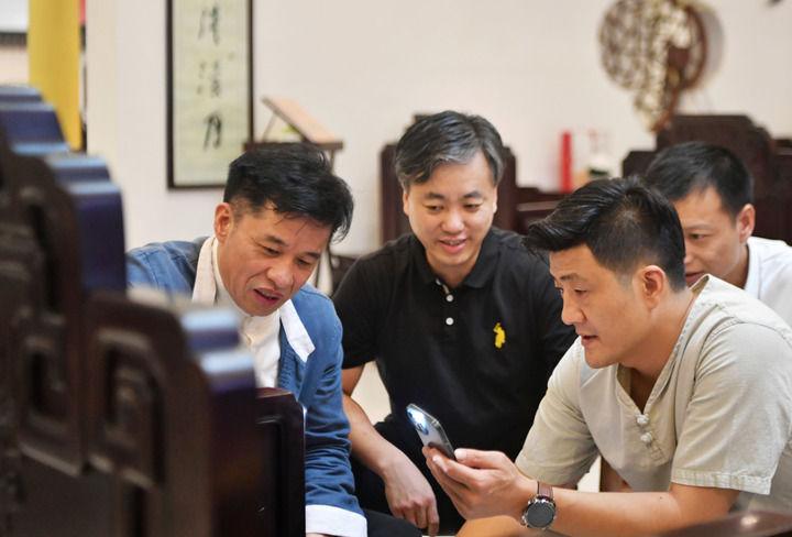 陈玉树(左一)与木雕省级非遗传承人林飞鹤(左三)、吴立波(左二)和林青(右一)共同探讨古典家具制作技艺(6月10日摄)新华社记者 魏培全 摄