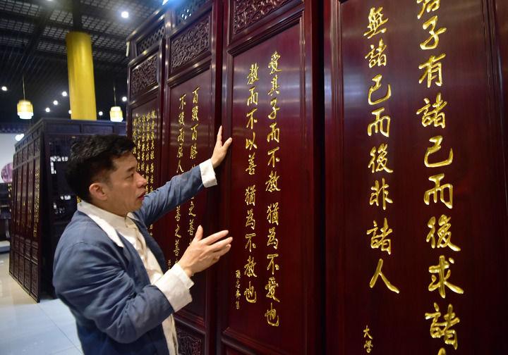 陈玉树在介绍他创作的红木屏风家具作品。这款海外华侨订制的古典家具作品将发往新加坡(6月10日摄)。新华社记者 魏培全 摄