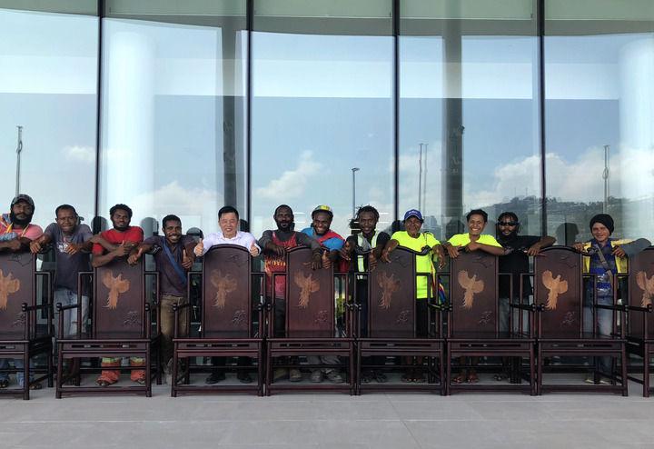 陈玉树(左五)与巴布亚新几内亚工人一起拼装亮相2018年巴布亚新几内亚APEC会议上中国古典家具作品《祥瑞》(2018年10月23日摄 ,手机资料照片,受访者提供)。新华社发